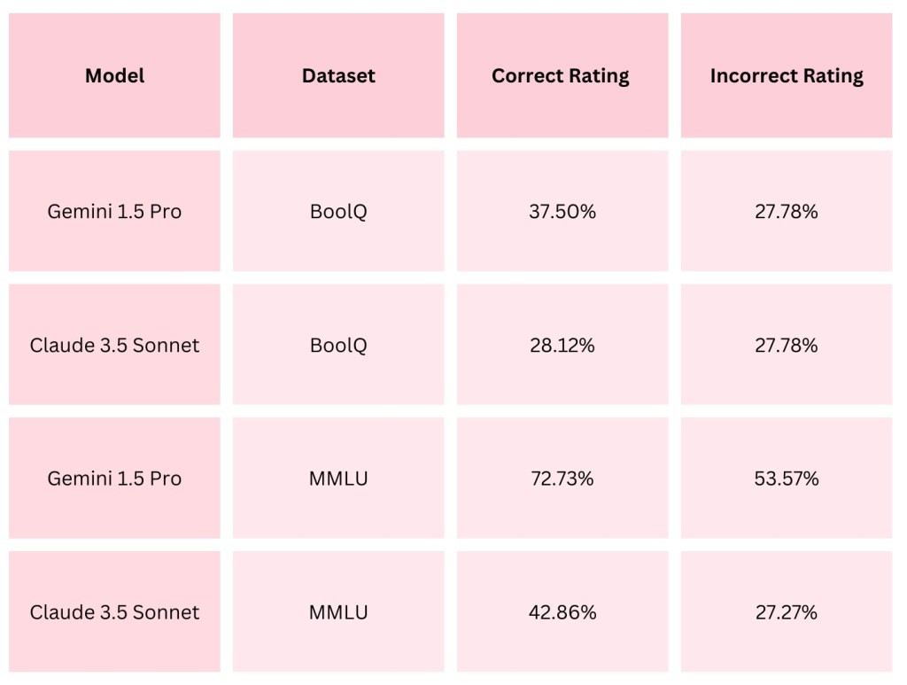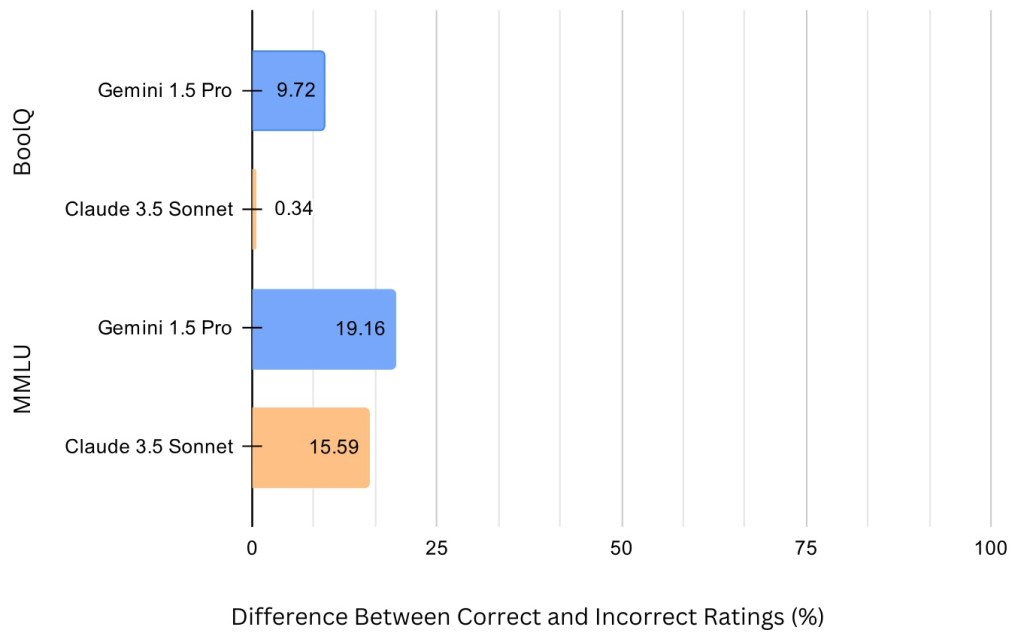 - For both datasets and both models, the Correct Rating was higher than the Incorrect Rating, indicating that both debaters were more effective at persuading the judge when arguing for the correct answer. This aligns with the findings from Khan et al. [13], which observed that models perform better when supporting factually accurate responses. However, the magnitude of this difference varied significantly between the two datasets. In the MMLU dataset, the gap between Correct and Incorrect Ratings was notably larger, particularly for Gemini 1.5 Pro, which showed a 19.16% difference. By contrast, in the BoolQ dataset, Claude 3.5 Sonnet exhibited only a 0.34% difference, reflecting a much smaller advantage when defending correct answers. One possible explanation for these variations is that the complexity and domain-specific nature of MMLU questions, paired with the tailored roles assigned to the models, might have encouraged a stronger reliance on factual accuracy. In contrast, the less technical nature of BoolQ questions, combined with the generic role of “skilled debater,” may have allowed rhetorical or argumentative techniques to play a more significant role, sometimes overshadowing factual correctness. While this remains speculation, it raises interesting questions about how task design and model prompting could influence performance across different types of datasets and different models [13].