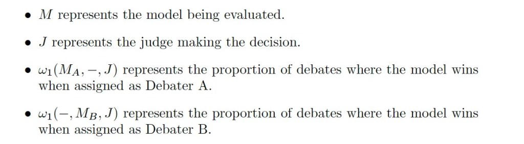 Measures how often a model successfully convinces the judge, providing insights into its persuasive ability. Since some answers may be easier to argue and each model participates as both Debater A and Debater B across different configurations, the win rate is calculated per model to mitigate positional biases using the formula: