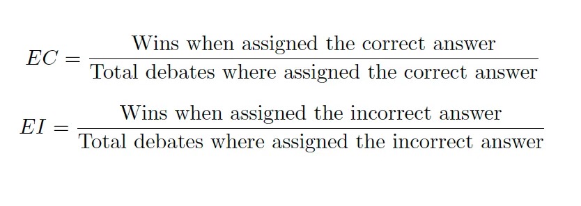 To calculate these metrics fairly across different debate configurations, I analyze each debater’s performance under both roles (Debater A and Debater B). The formulas used are: