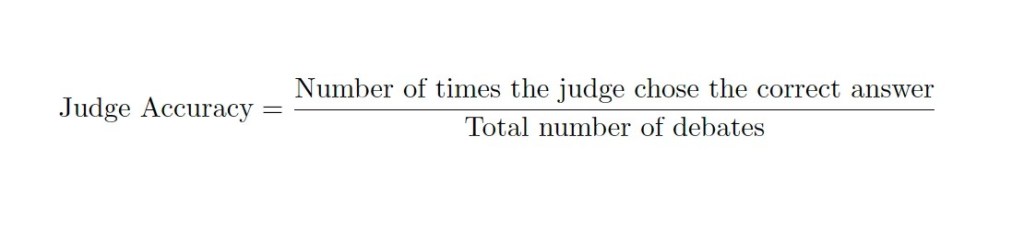 To assess the performance of the debaters and the judge, I adapted evaluation metrics from Khan et al. [13] and Kenton et al. [14], modifying them to better fit my experimental setup. Unlike Khan et al., who primarily evaluated debates between copies of the same model, my study involved two different models as debaters. Therefore, I measured judge accuracy separately for each configuration rather than aggregating across identical models and I calculated win rates per model to account for differences in persuasiveness. Additionally, given my smaller sample size, I averaged results across configurations to mitigate potential biases introduced by role assignments.